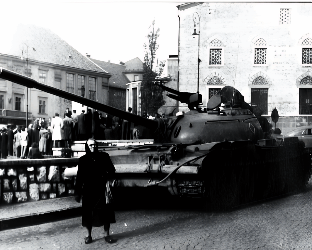 A mellékelt képen szovjet harckocsi látható a pécsi Széchenyi téren, valószínűleg 1956. november 4-én.