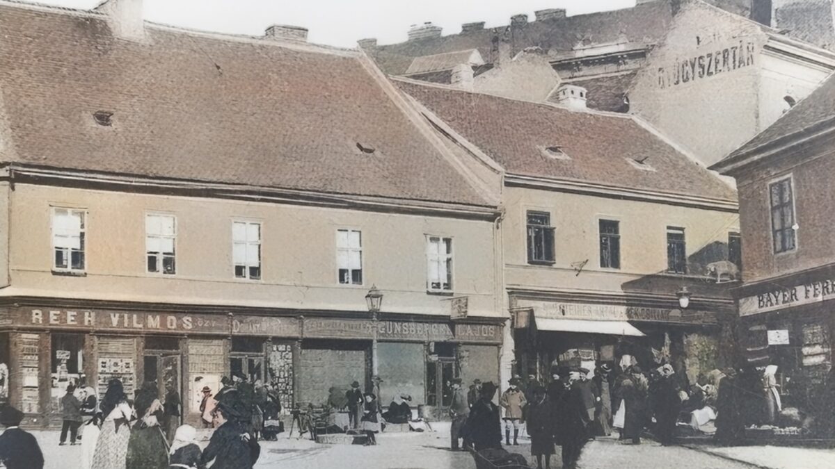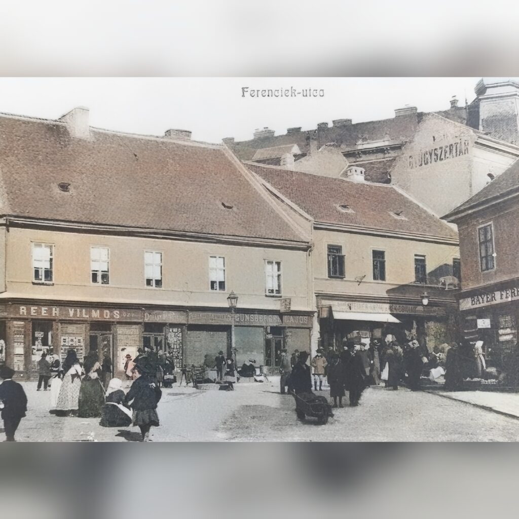A Jókai tér a Ferencesek utcájával és az Elefántos házzal, feltehetően a 20. század elején készült felvételen, digitálisan színezett változatban. Forrás: Csorba Győző Könyvtár Helyismereti Gyűjtemény, Pécs.